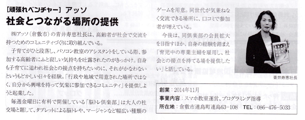 倉敷スマホ教室アッソでは、スマートフォンやタブレットを使った50歳からの新しいコミュニティづくりを目指しています。